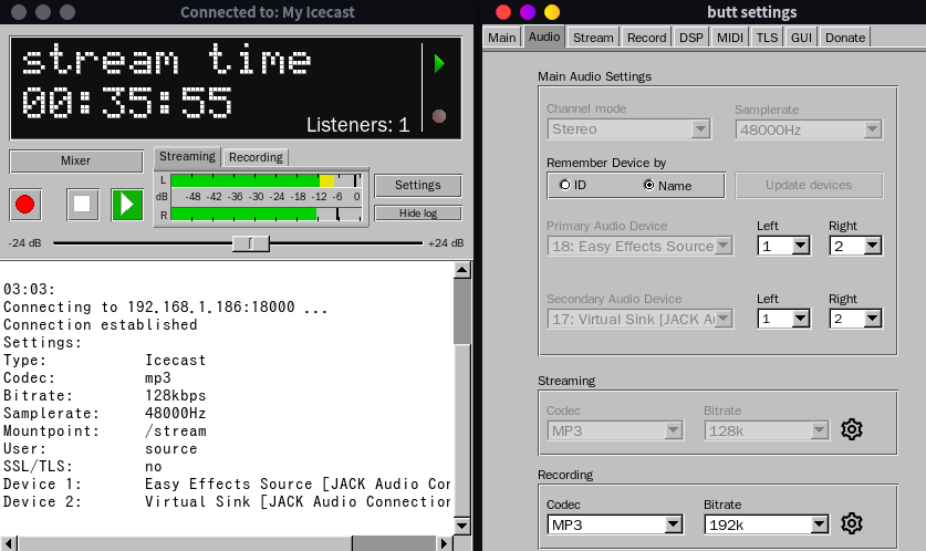 立ち上がったら Settings → Audio → Update devices を押し、Virtual_Sink.monitor(メニュー上は「Virtual_Sink」)がリストに出ることを確認して完了。