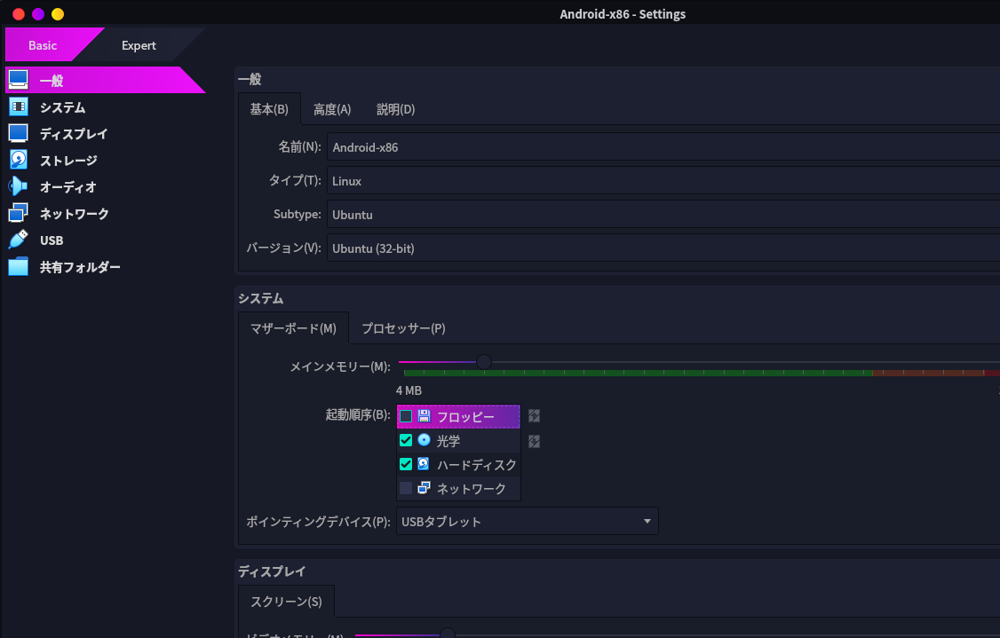 「新規」ボタン → 名前(例: Android-x86)を入力