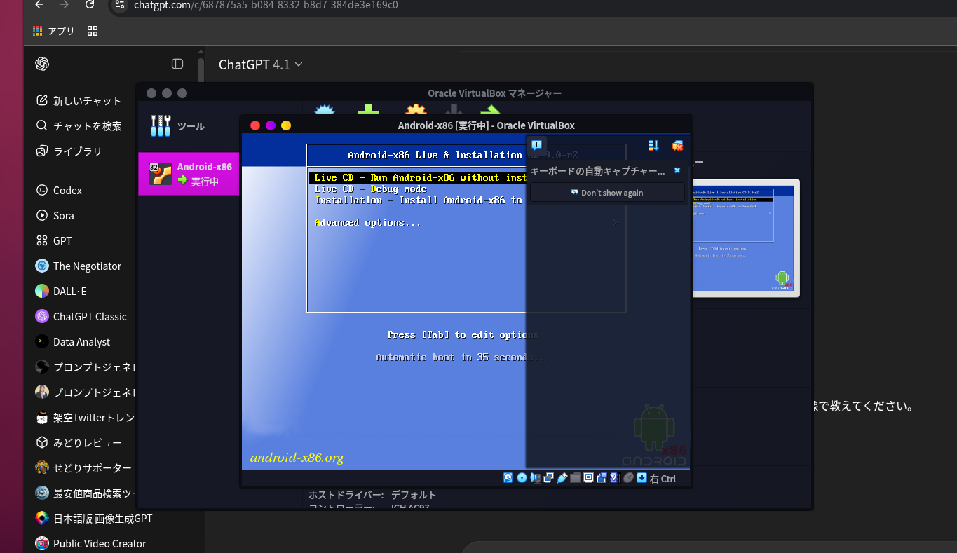 VirtualBoxのマネージャー画面で「Android-x86」を選択