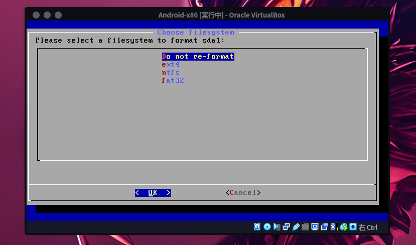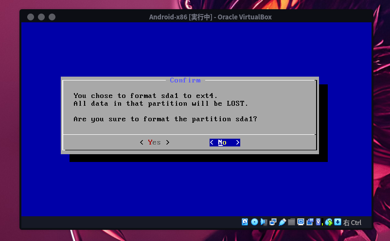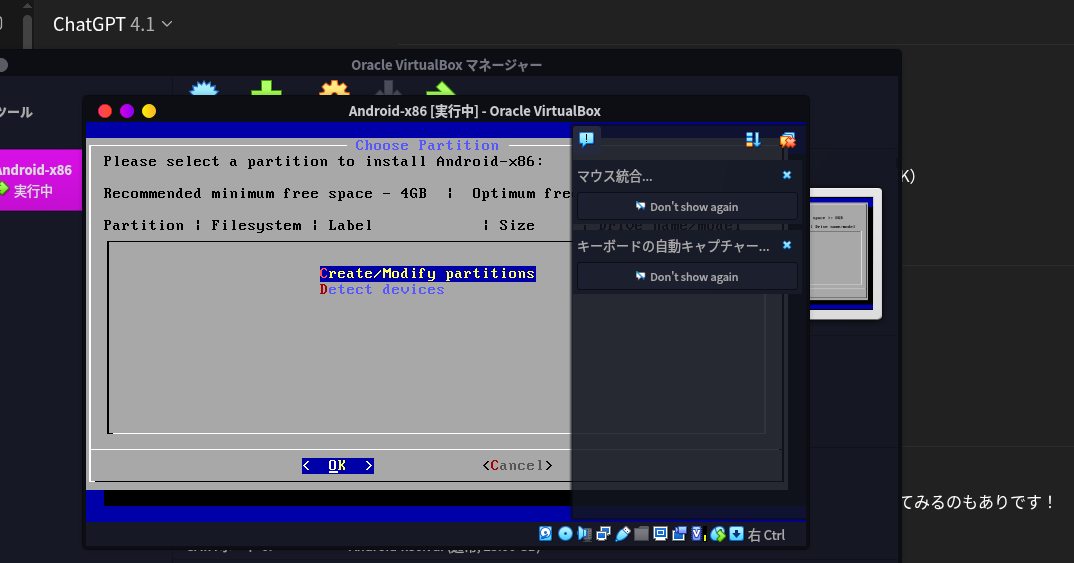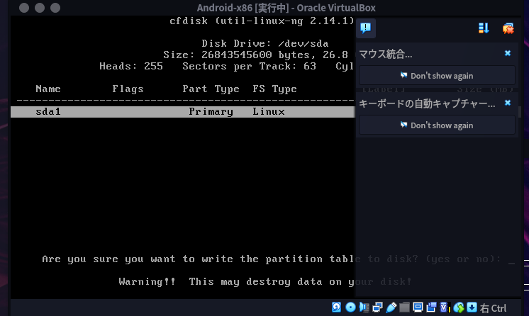 このパーティション作成がAndroid-x86仮想環境で一番つまづきやすい所です。